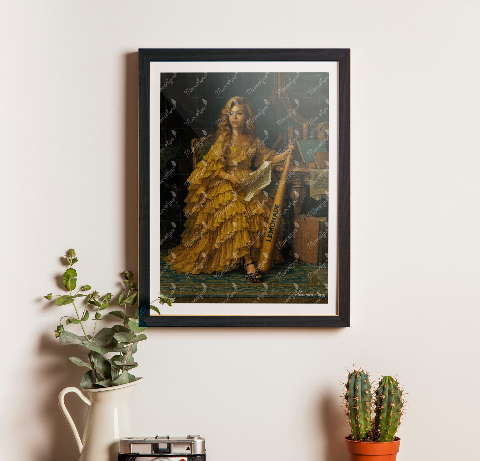 Œuvre d’art originale représentant Beyoncé, inspirée de l’univers puissant et symbolique de l’album Lemonade. Ce portrait revisite l’icône contemporaine à travers une esthétique classique, mêlant portrait aristocratique, culture pop et narration visuelle engagée.
