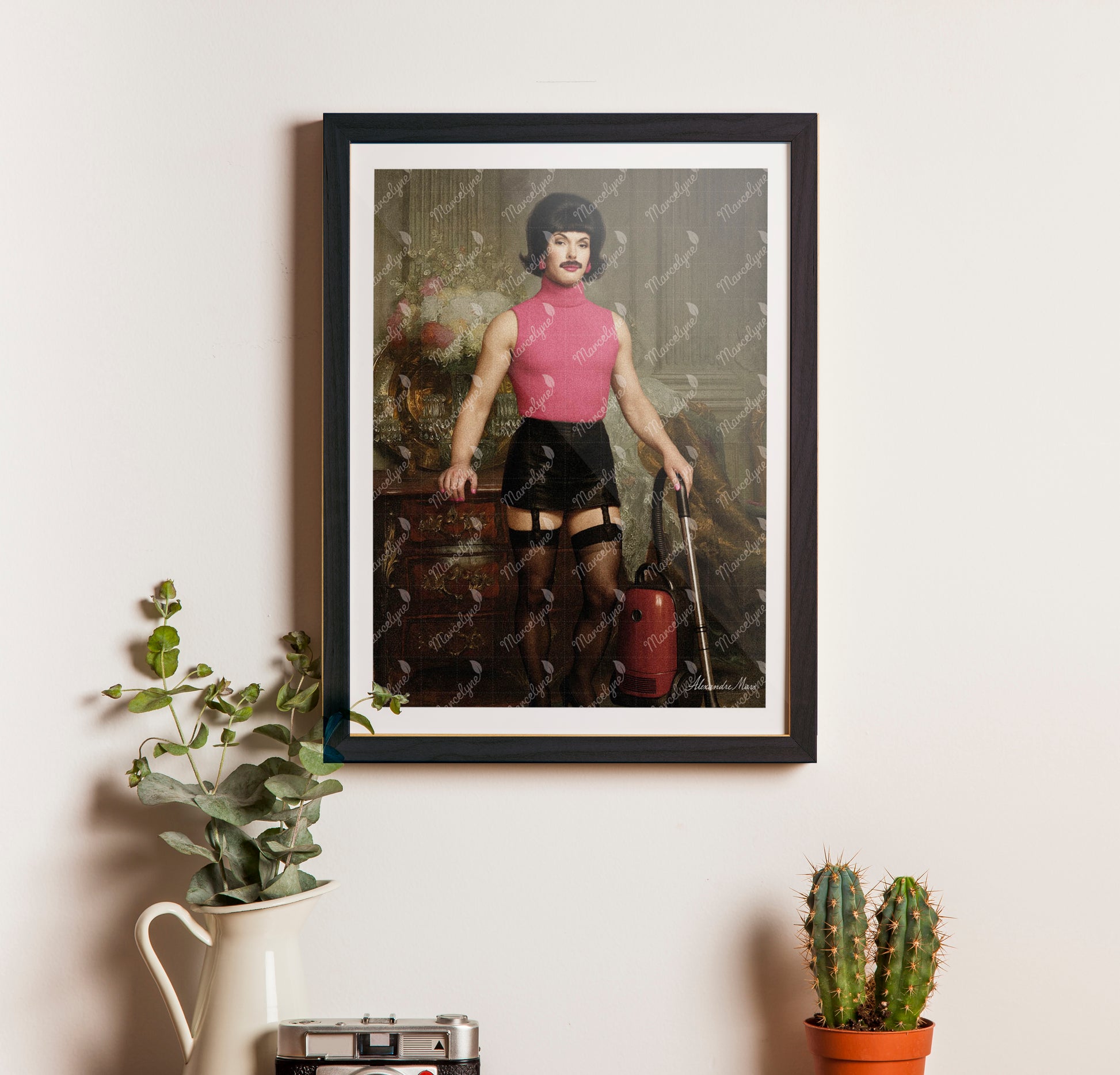 La présence d’un aspirateur rétro, clin d’œil direct au clip original, apporte une touche mordante et hilarante. Cette fusion entre art classique et culture pop crée une image à la fois chic, punk, queer-friendly et délicieusement décalée.