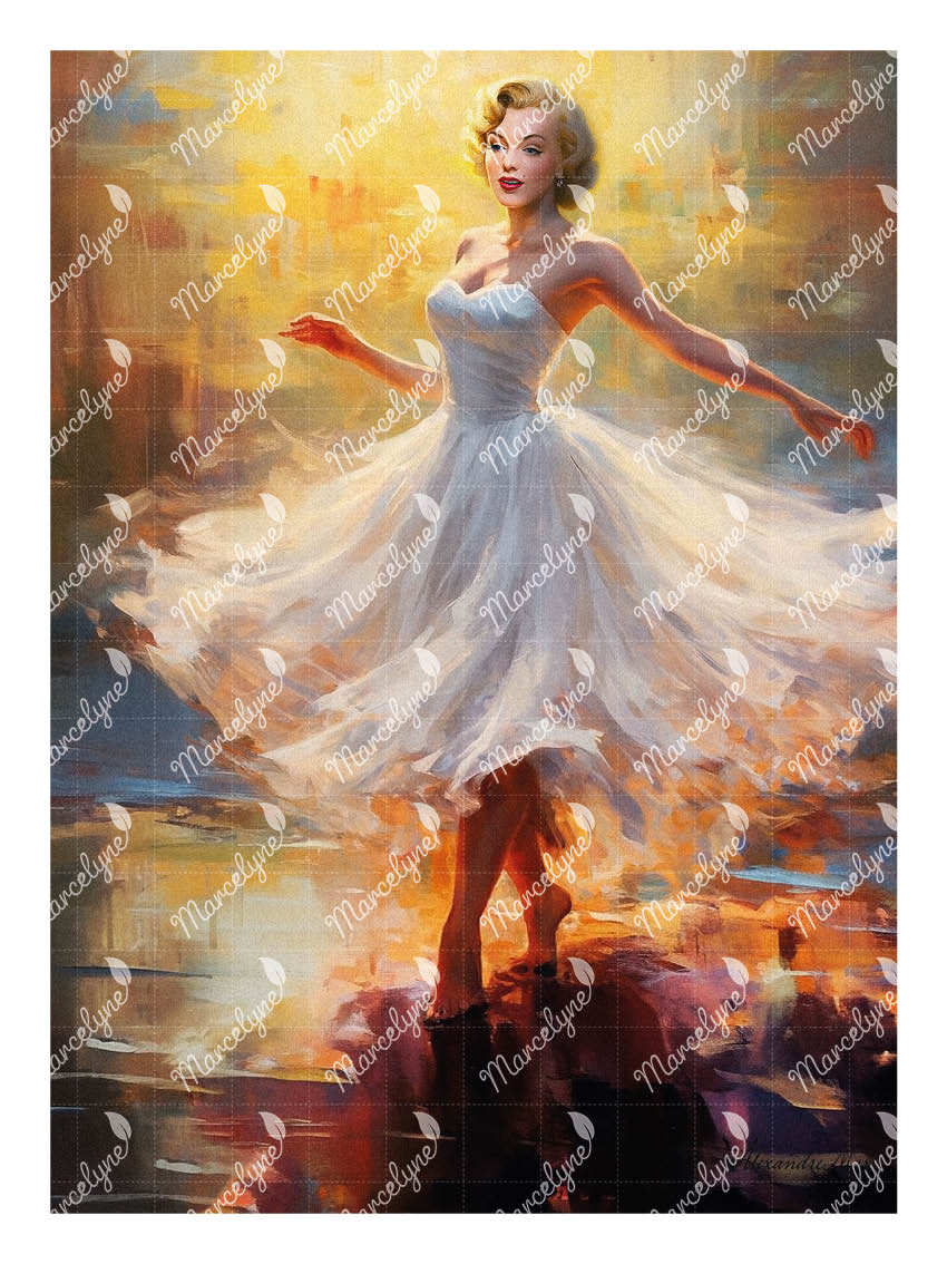Son visage, sublimé par une expression douce et confiante, incarne la beauté lumineuse des grandes stars du cinéma classique. Ses cheveux blonds, ondulés avec soin, et son port gracieux rappellent l’âge d’or du glamour : celui des studios, des projecteurs chauds et des icônes légendaires qui traversent le temps.