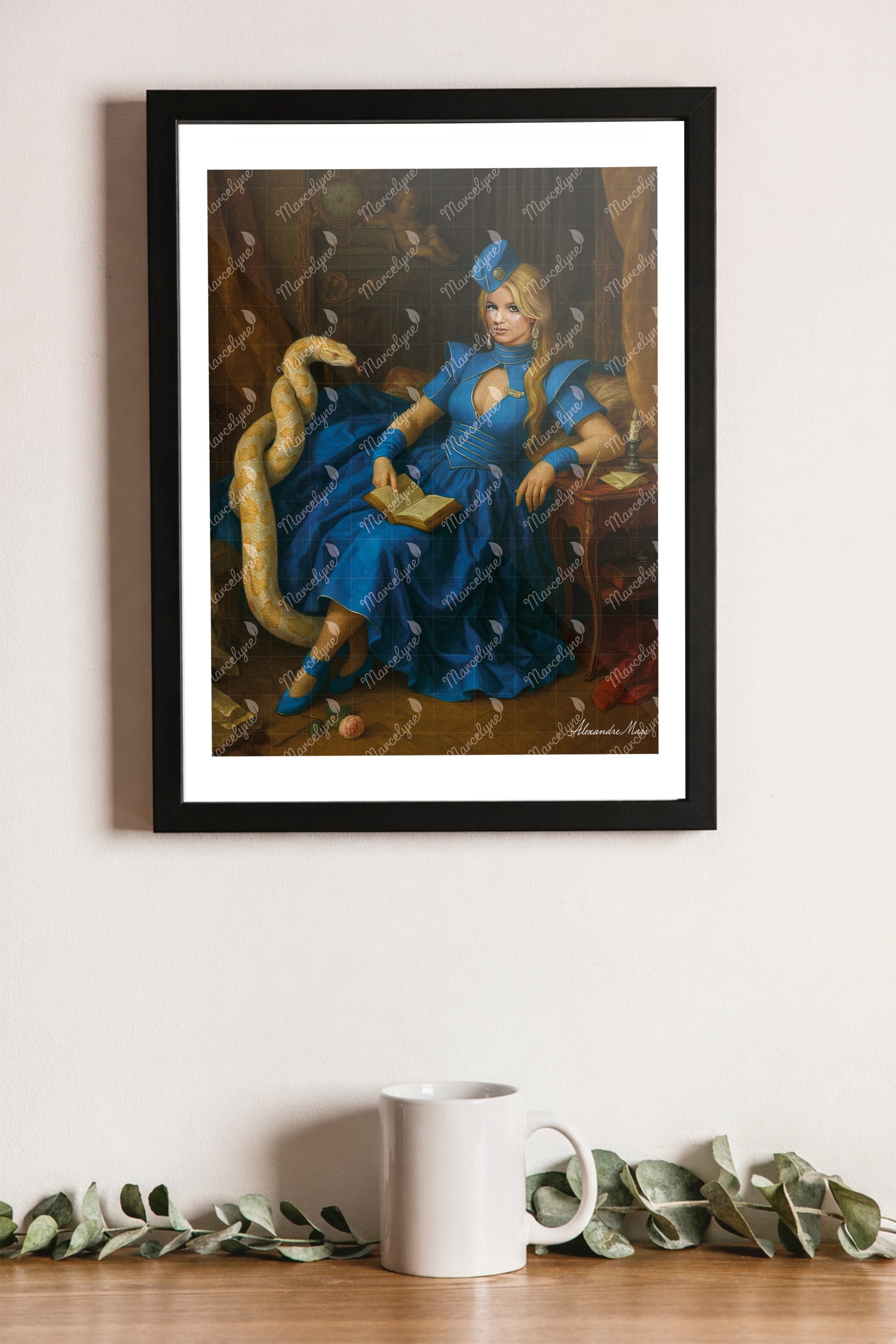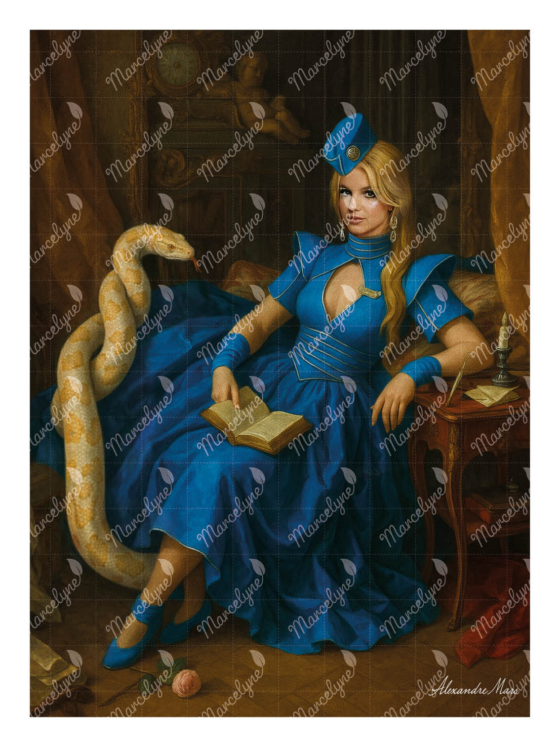 La robe bleue, structurée et fluide, capte immédiatement le regard. Elle incarne à la fois la pureté apparente et la dangerosité assumée, signature absolue de Britney Spears à son apogée artistique. L’arrière-plan aux accents baroques, la lumière douce et la palette raffinée confèrent à ce tableau une atmosphère de peinture ancienne, entre portrait aristocratique et icône pop contemporaine.
