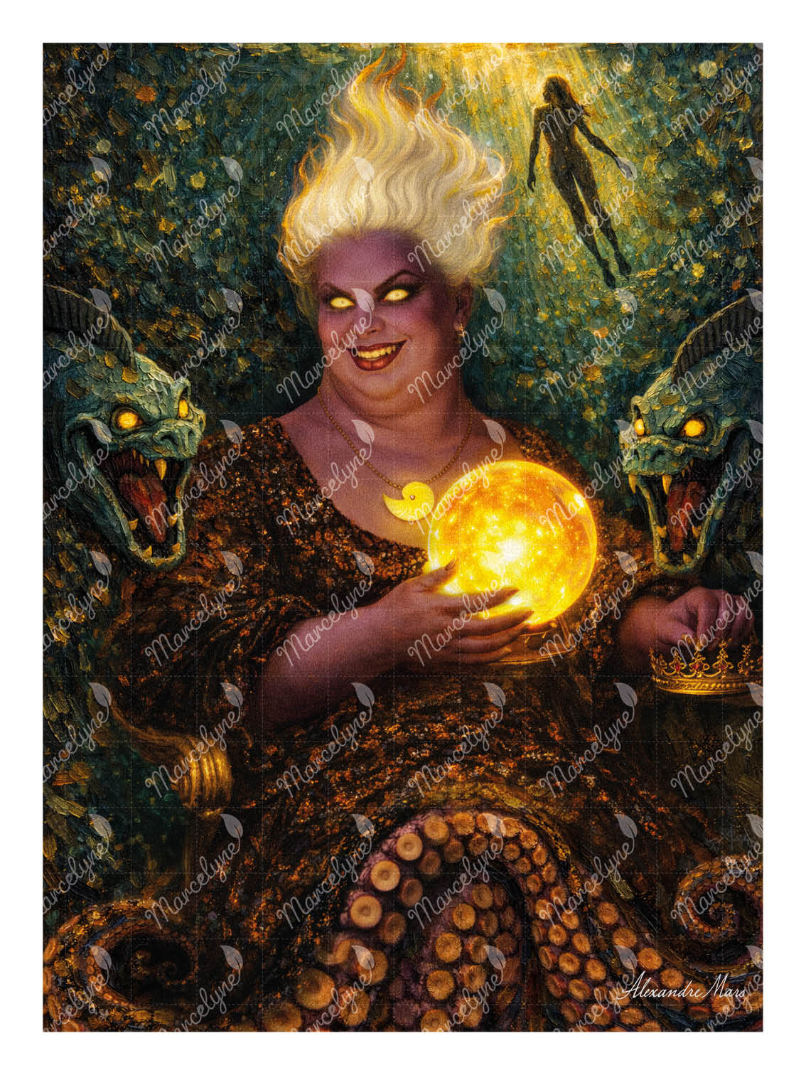 La figure centrale, souveraine des océans, reprend l’attitude solennelle et frontale de La Palatine, tout en incarnant une divinité marine inquiétante et fascinante. Son regard lumineux, chargé de malice et de domination, contraste avec la douceur apparente de son sourire. Entre ses mains, une sphère dorée incandescente symbolise le pouvoir, la connaissance ancienne et le contrôle des forces abyssales.